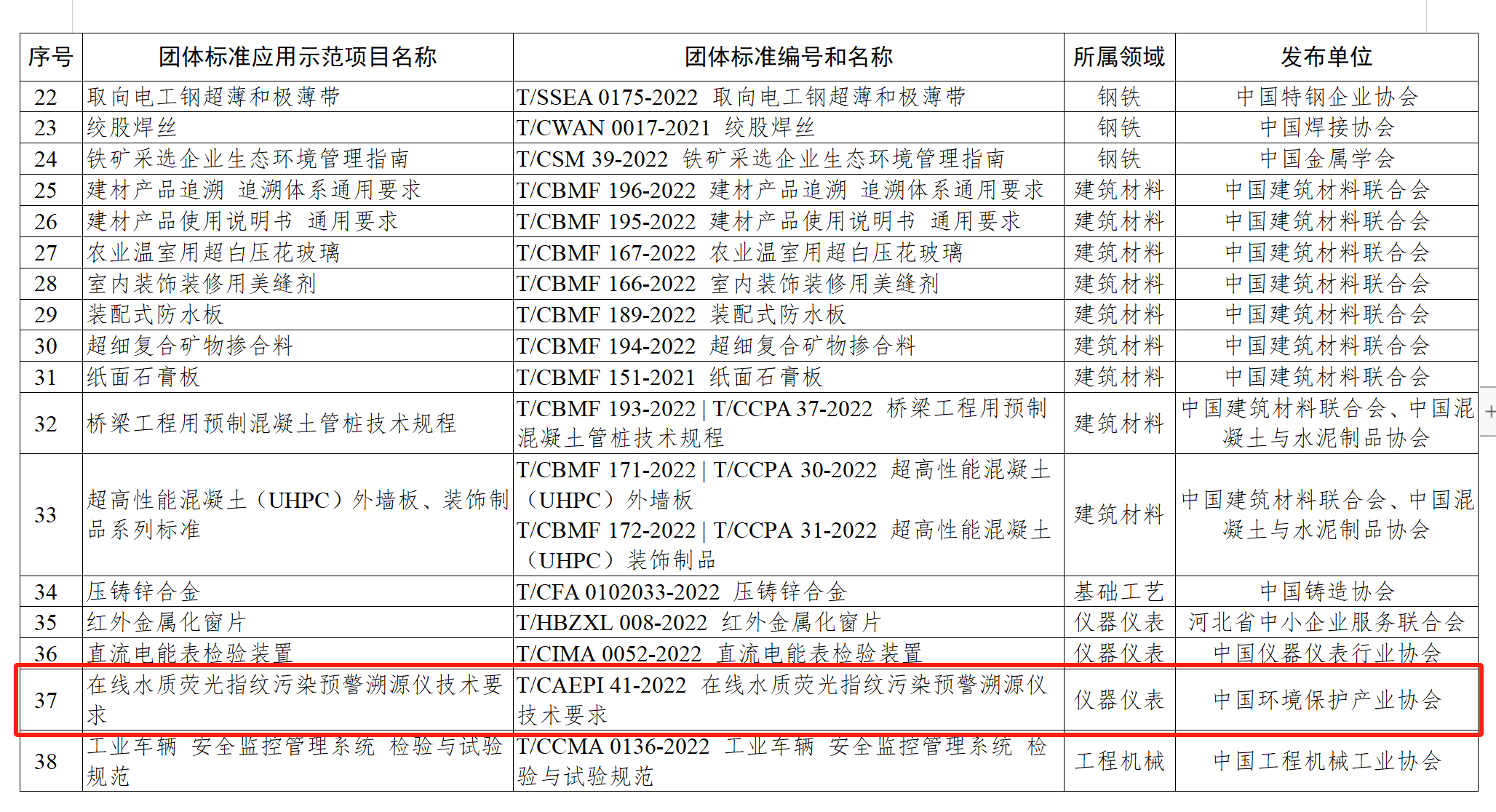 近日,由清華大學和中國環(huán)境監(jiān)測總站牽頭,我司參與編寫,由中國環(huán)保產(chǎn)業(yè)協(xié)會發(fā)布的團體標準《在線水質(zhì)熒光指紋污染預警溯源儀技術(shù)要求》(T/CAEPI 41-2022 ),按照相關(guān)要求經(jīng)過申請、推薦、技術(shù)初審和專家評審等環(huán)節(jié),作為唯一一項環(huán)保儀器標準入選工信部2023年百項團體標準應用示范項目。
