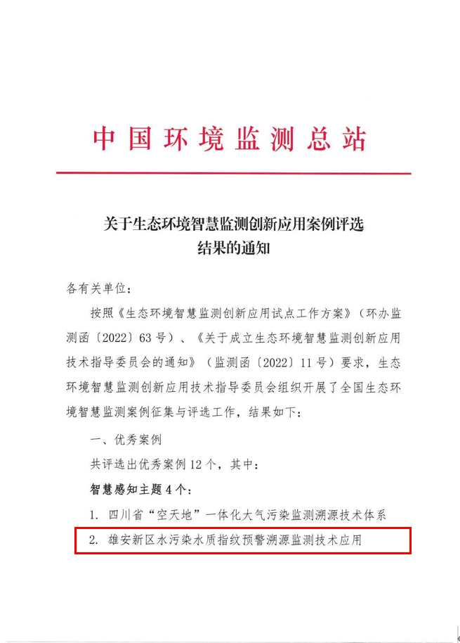 | 喜報(bào)!《雄安新區(qū)水污染水質(zhì)指紋溯源監(jiān)測(cè)技術(shù)應(yīng)用》入選生態(tài)環(huán)境智慧監(jiān)測(cè)創(chuàng)新應(yīng)用案例 |