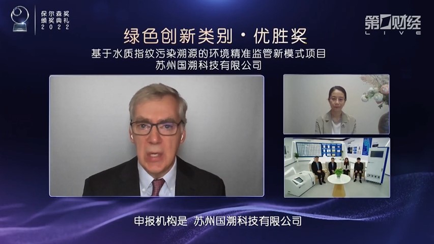 2022年12月15日,由保爾森基金會與清華大學(xué)聯(lián)合主辦的2022年“保爾森可持續(xù)發(fā)展獎(jiǎng)”(簡稱:保爾森獎(jiǎng))頒獎(jiǎng)典禮在線隆重舉行。國溯科技申報(bào)的“基于水質(zhì)指紋污染溯源的環(huán)境精準(zhǔn)監(jiān)管新模式”項(xiàng)目脫穎而出,位列三甲,斬獲“綠色創(chuàng)新”類別優(yōu)勝獎(jiǎng),被表彰其“通過創(chuàng)新的技術(shù)和模式,以智能化和戰(zhàn)略性的數(shù)據(jù)應(yīng)用和分析而產(chǎn)生的變革性影響力”。